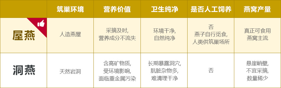 屋燕为吐唾液量较多的金丝燕所筑。金丝燕在优良的燕屋环境里筑巢,所筑的燕窝含有较少的羽毛与杂质。屋燕筑巢环境含较少盐份杂质,所以比起洞燕,屋燕少受污染,较易于炖煮,口感上比较香浓滑溜。食用之余较易被人体消化吸收。此外,由于燕子多在较易为人所触及的地方筑巢,收集到成品过程较洞燕简便,相较之下,屋燕更为新鲜纯正,且价钱较洞燕廉宜。