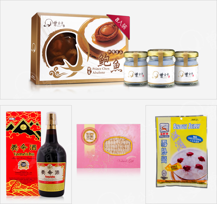 | 商品规格 : | 曾公子鲍鱼(8颗装)- 1盒, 曾公子燕窝 40ml - 3瓶, 养命酒 - 1瓶, 花旗参 - 1盒, 雪蛤 - 1包 |